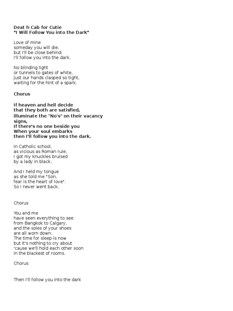 I Will Follow You Into The Dark Wikipedia from upload.wikimedia.org Check spelling or type a new query. We did not find results for: I will follow you into the dark lyrics. Maybe you would like to learn more about one of these?